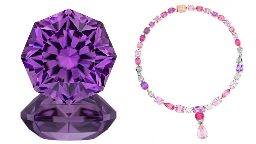The Spectrum Buyer’s Choice Award went to designer Mimi So for her “Cotton Candy” necklace, crafted in 18-karat rose gold. The piece showcases a 16.71-carat pear-shaped kunzite, a 4.05-carat vivid pink spinel, and a 5.65-carat imperial topaz, adorned with sapphires, spinels, tourmalines, and diamonds totalling more than 80 carats. The same design also earned an honourable mention in the Spectrum Evening Wear category.